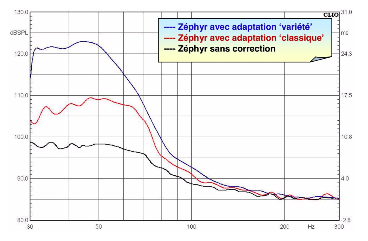 Corrections électroniques Zéphyr : retard 15 ms (classique) vs 26 ms (variété) à 50 Hz — déterminés par comparaisons auditives avec des ingénieurs du son en conditions réelles