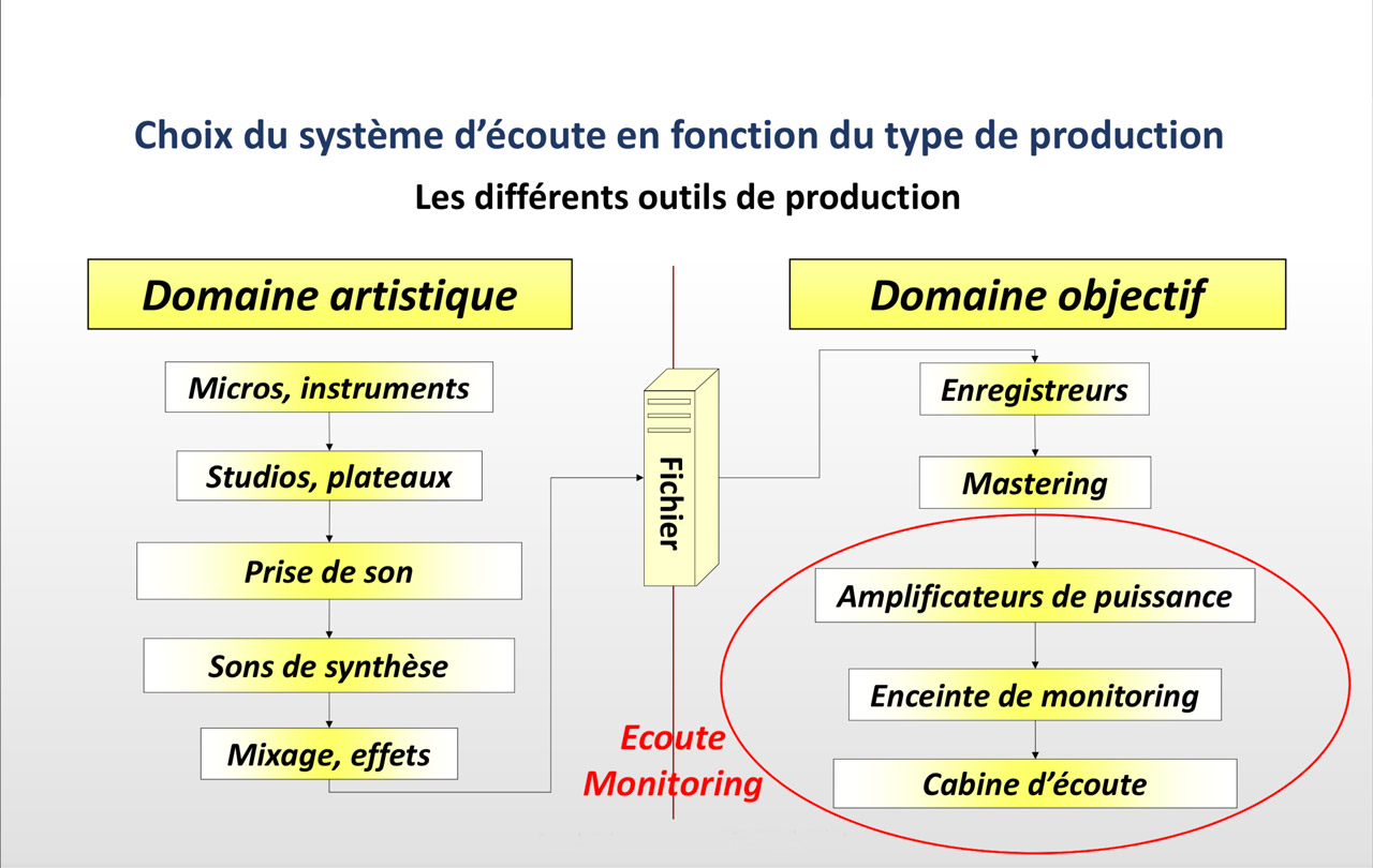 Nous retrouvons des systèmes d'écoute en beaucoup d'endroits de la chaîne audiovisuelle. Ces écoutes ont des finalités très différentes suivant qu'elles se trouvent dans le domaine artistique ou le domaine objectif. Nous devons donc faire la distinction entre ces différents types et ces deux domaines.