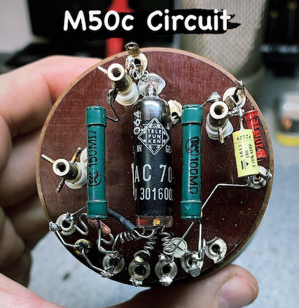 Produit de 1951 à 1971, Le M50 est un micro omnidirectionnel à petite membrane utilisant le même boîtier, la même électronique et la même lampe (la MSC2 puis l’AC701) mais pas la même capsule que le M49.