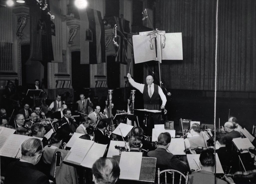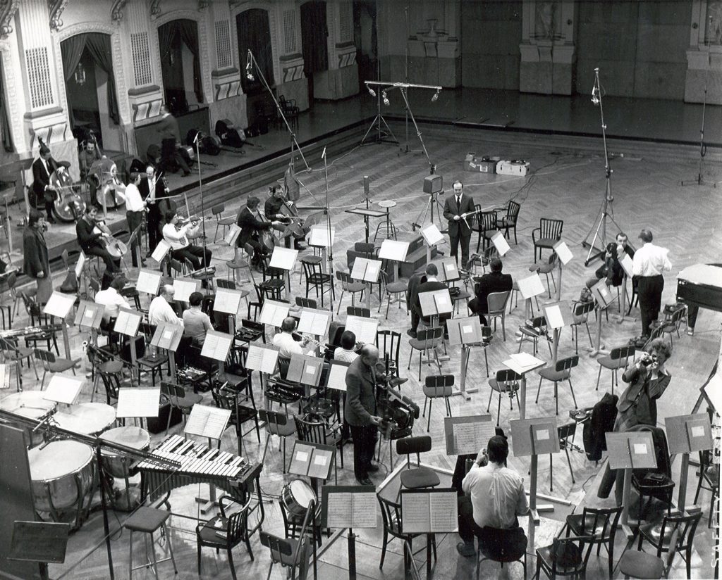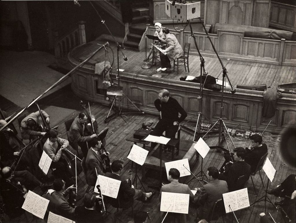 Les philosophies d’origines finirent par fusionner. Mais jusque dans les années 60, les panneaux entre les micros sont encore parfois utilisés. C’est finalement en 1964 que la configuration standard est adoptée par tous. Avec en plus un micro au centre au-dessus de l’orchestre (on le voit bien sur la photo précédente) et des appoints sur les côtés.
