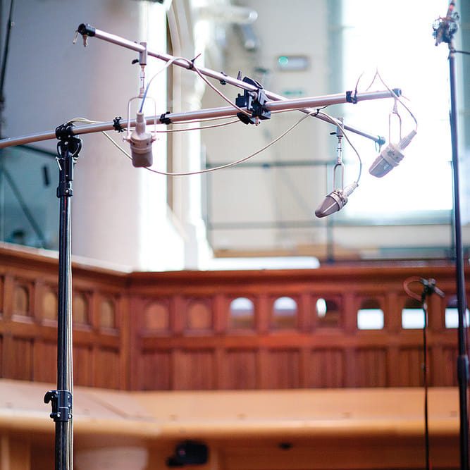 Ils rassemblèrent alors des pieds de micros en forme de T et fixèrent trois M49 aux extrémités dans une structure beaucoup plus rapprochée que celle à laquelle nous sommes désormais habitués. Fixé en hauteur derrière le chef d’orchestre, il s’agissait une fois de plus de recréer la perception d’une tête humaine.