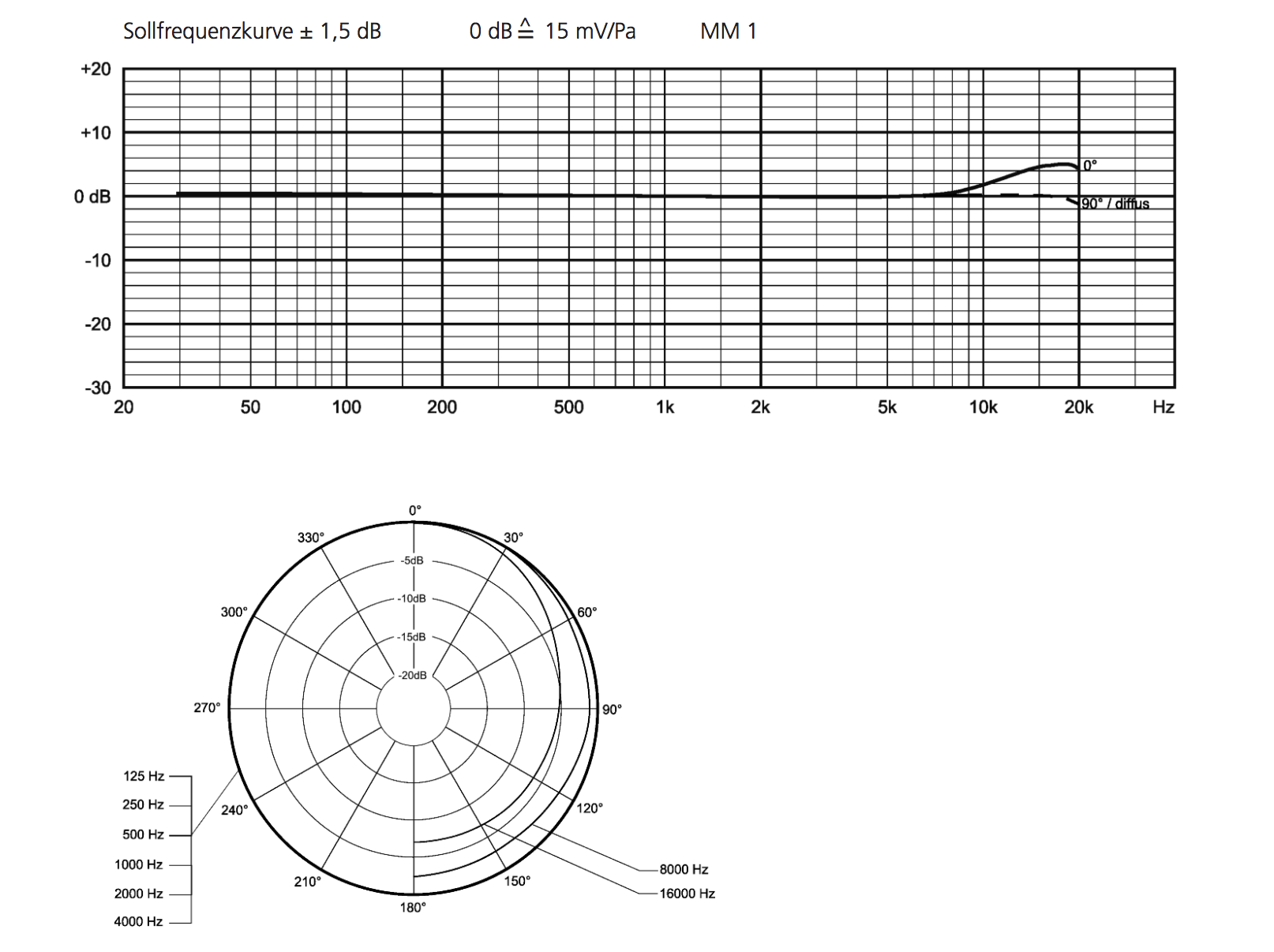 Voici la réponse en fréquence et la polaire d'un Beyerdynamic MM1. On constate que c'est un capteur de champ diffus. Car à 0° il y a une légère bosse dans l'aigu. A partir de 90°, cette réponse redevient parfaitement droite.